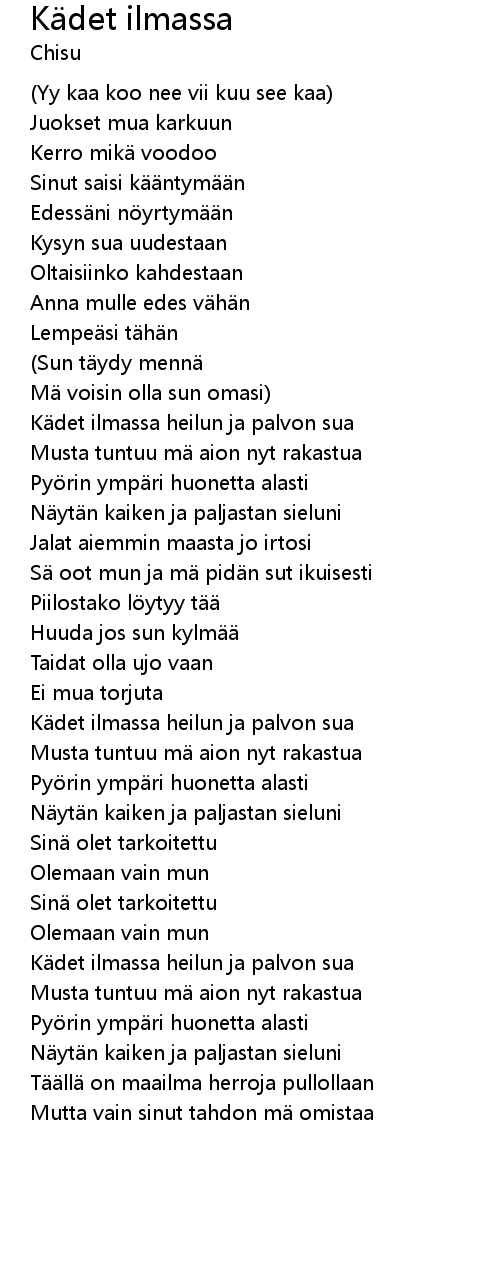 | Kädet ilmassa heilun ja palvon sua | |