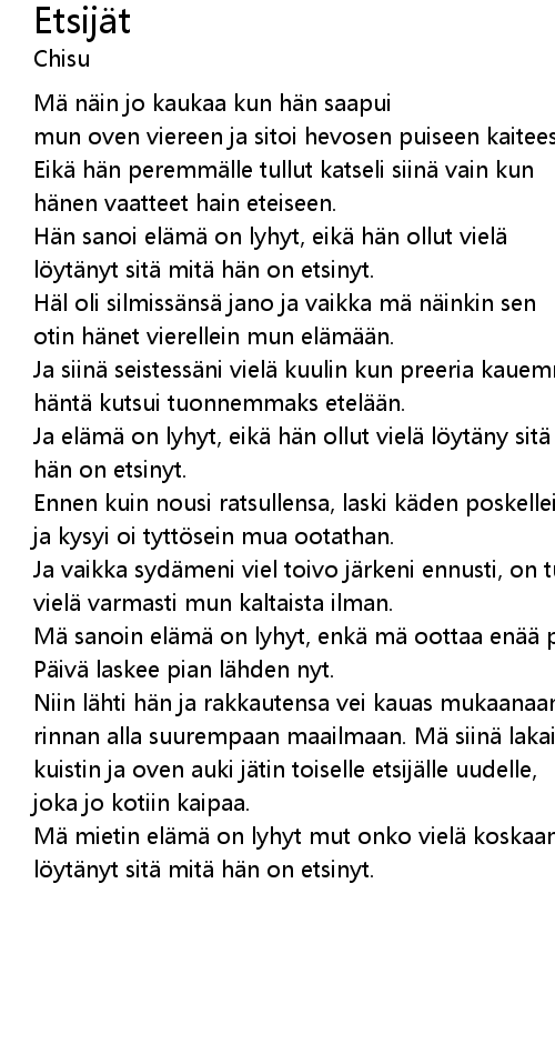| Ja elämä on lyhyt, eikä hän ollut vielä löytäny sitä mitä | |