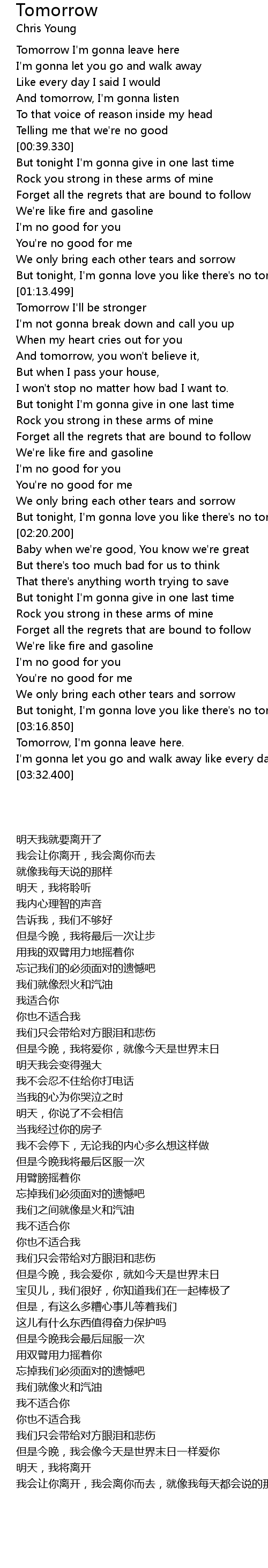 | [00:13.570] | Tomorrow I' m gonna leave here |