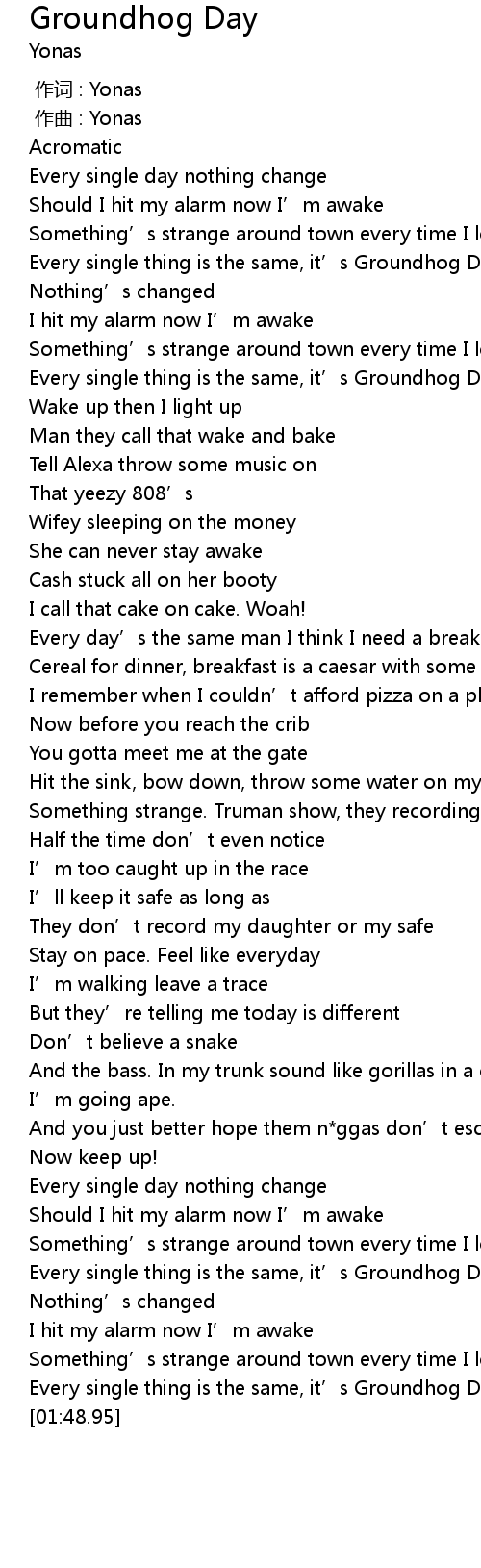 | [01:44.61] | Every single thing is the same, it' s Groundhog Day |