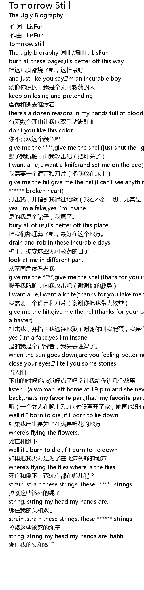 | [00:15.945] | The ugly bioraphy 词曲/编曲:LisFun |