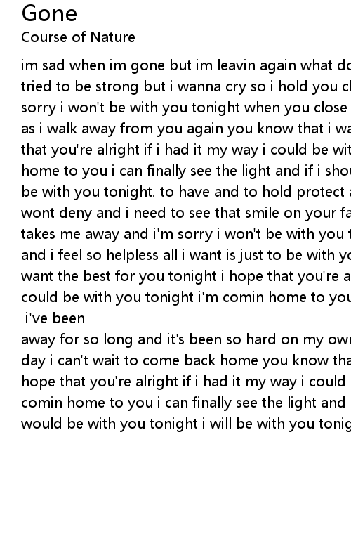 im sad when im gone but im leavin again what do you think did you even care i tried to be strong but i wanna cry so i hold you close as i say good bye and i'm sorry i won't be with you tonight when you close your eyes and i feel so guilty as i walk away from you again you know that i want the best for you and i hope that you're alright if i had it my way i could be with you tonight i'm comin home to you i can finally see the light and if i should make it through i would be with you tonight. to have and to hold protect and provide all that you need i wont deny and i need to see that smile on your face the look in your eyes it takes me away and i'm sorry i won't be with you tonight but you're on my mind and i feel so helpless all i want is just to be with you again you know that i want the best for you tonight i hope that you're alright if i had it my way i could be with you tonight i'm comin home to you i can finally see the light and if i should make it through i will be with you tonight [guitar solo] i've been away for so long and it's been so hard on my own i think about you every single day i can't wait to come back home you know that i want the best for you and i hope that you're alright if i had it my way i could be with you tonight i'm comin home to you i can finally see the light and if i should make it through i would be with you tonight i will be with you tonight |