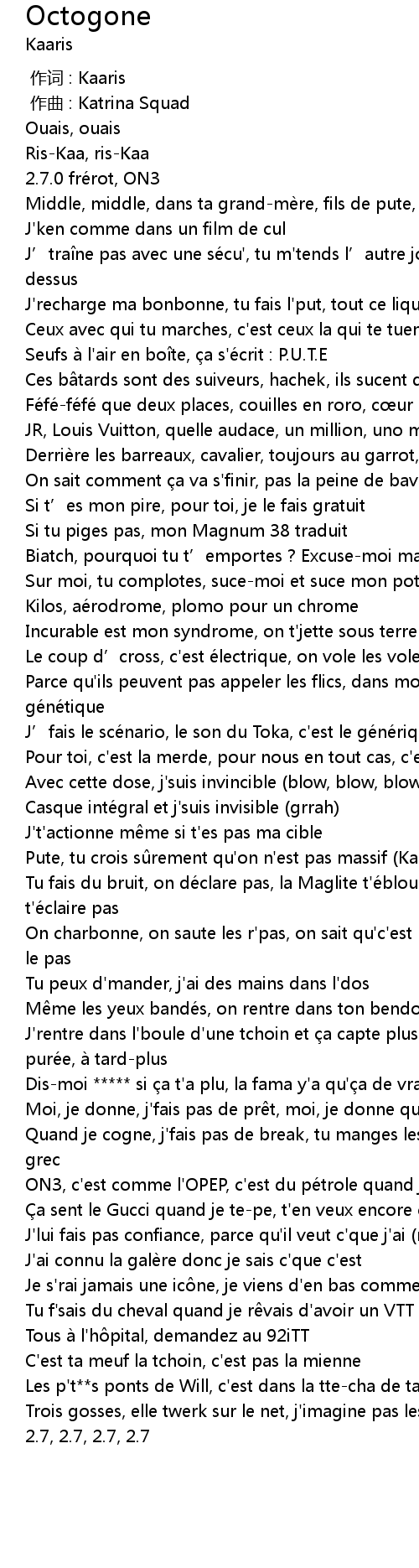 | [00:16.31] | J' tra ne pas avec une sé cu', tu m' tends l' autre joue, j' pisse dessus |