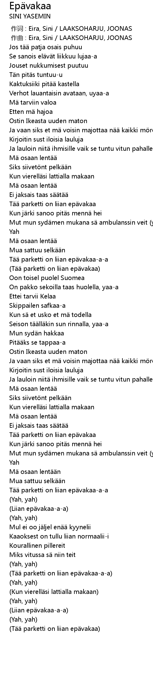 | [00:01.000] | 作曲 : Eira, Sini / LAAKSOHARJU, JOONAS |