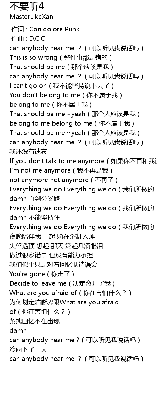 | [00:56.566] | I' m not me anymore wo bu zai shi wo |