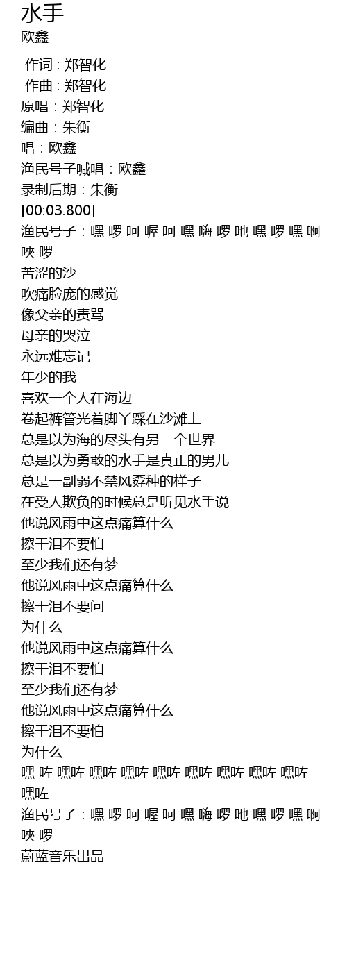 | [00:03.450] | 渔民号子喊唱:欧鑫 |
