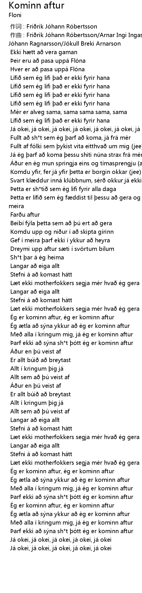 | [00:01.000] | zuò qǔ : Fri rik Jó hann Ró bertsson Arnar Ingi Ingason Magnú s Jó hann Ragnarsson J kull Breki Arnarson |