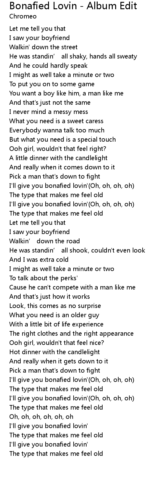 | [00:46.83] | I'll give you bonafied lovin'(Oh, oh, oh, oh) |
