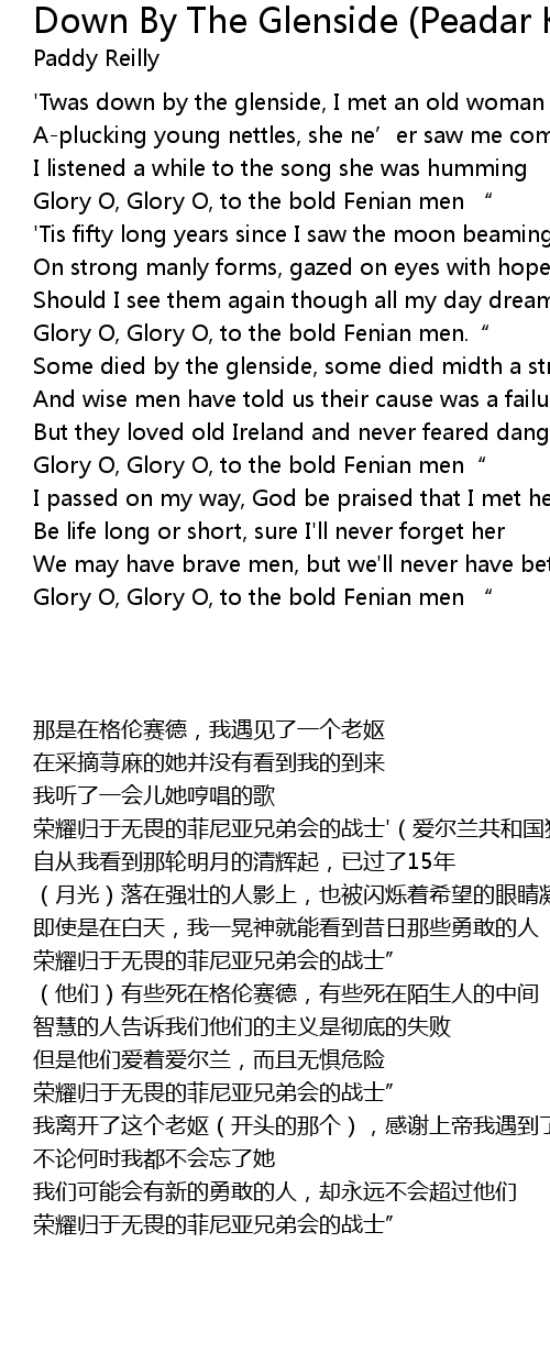 | [02:39.000] | Glory O, Glory O, to the bold Fenian men" |