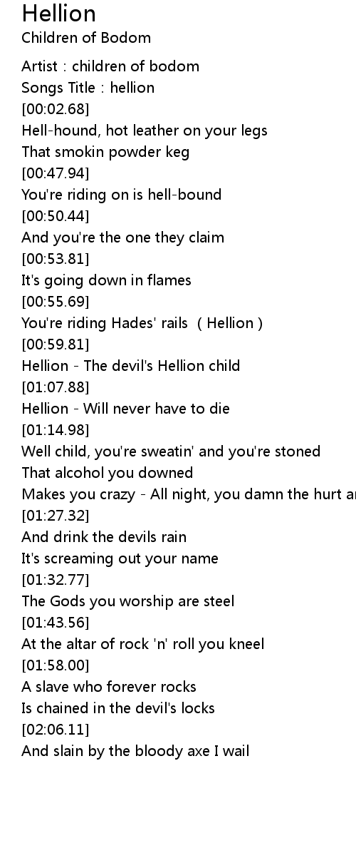 | [01:02.31] | Hellion The devil' s Hellion child |
