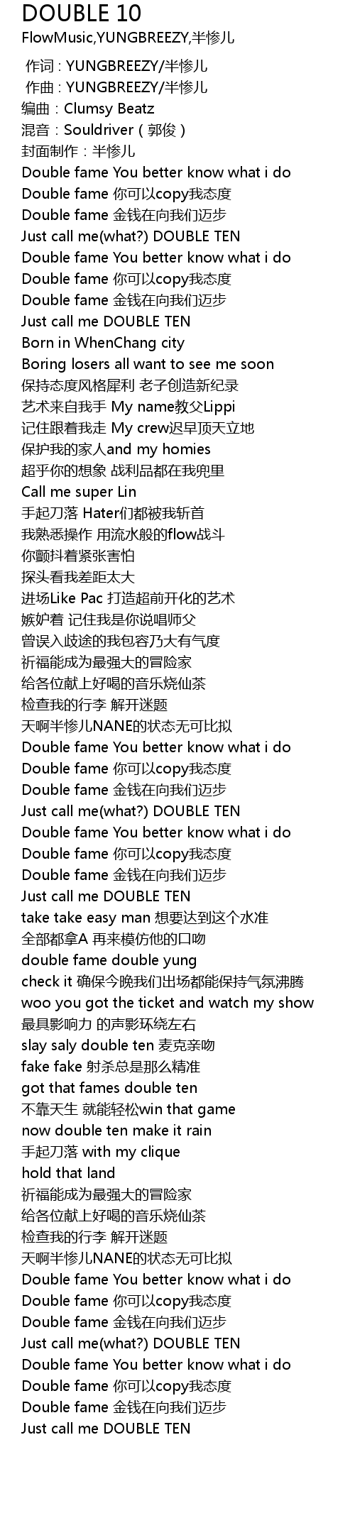 | [01:14.208] | Just call me what? DOUBLE TEN |