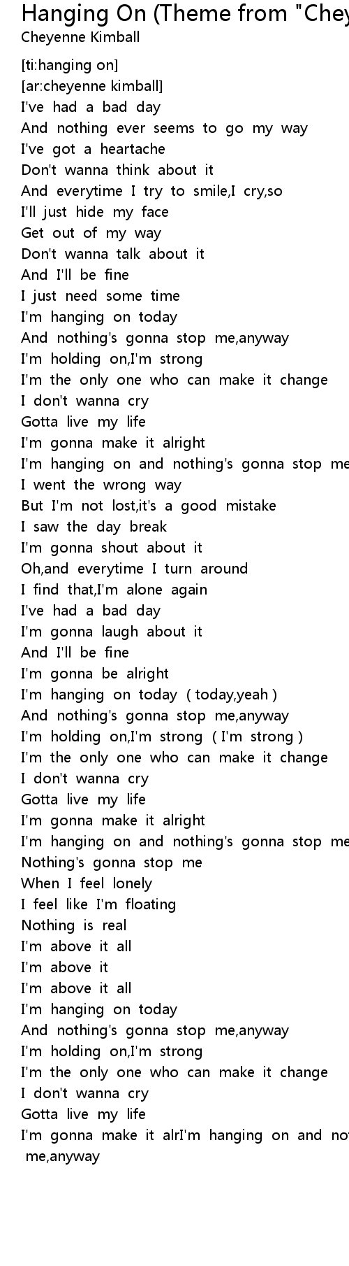 | [03:36.55] | I' m gonna make it alrI' m hanging on and nothing' s gonna stop me, anyway |