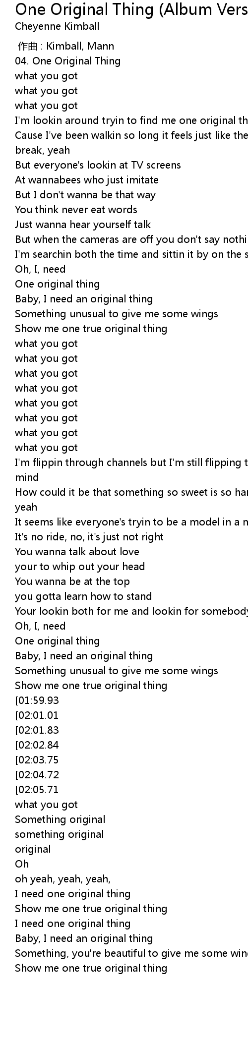 | [00:15.42] | I'm lookin around tryin to find me one original thing |