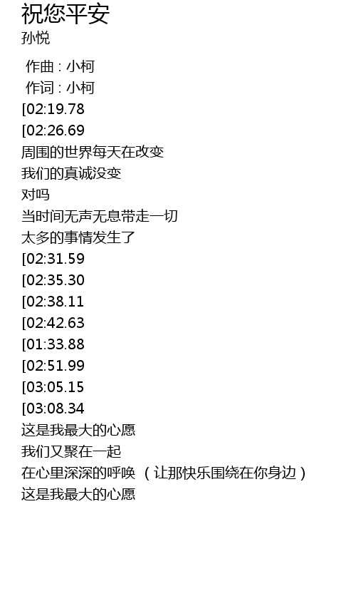| [01:20.84][01:33.88][02:45.86][02:58.90][03:18.84][03:32.09] | 祝你平安 |