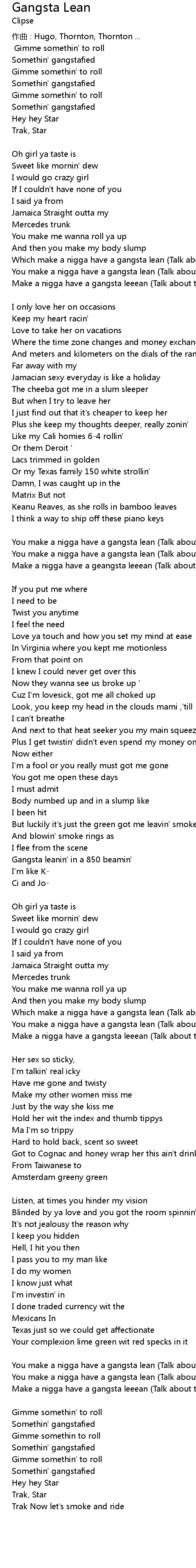 | You make a nigga havea gangsta lean (Talk about the gangsta lean) [Pusha T] | |