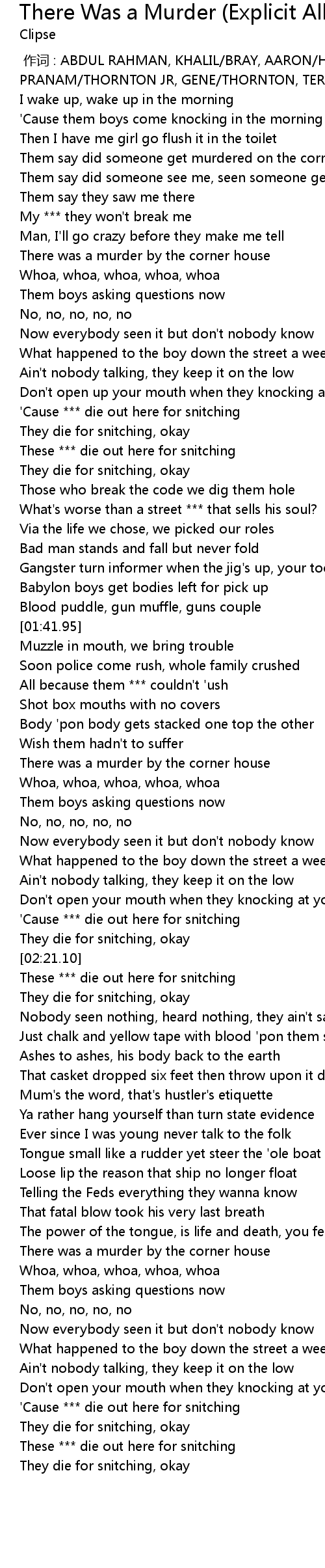 | [00:33.83] | Them say did someone get murdered on the corner |