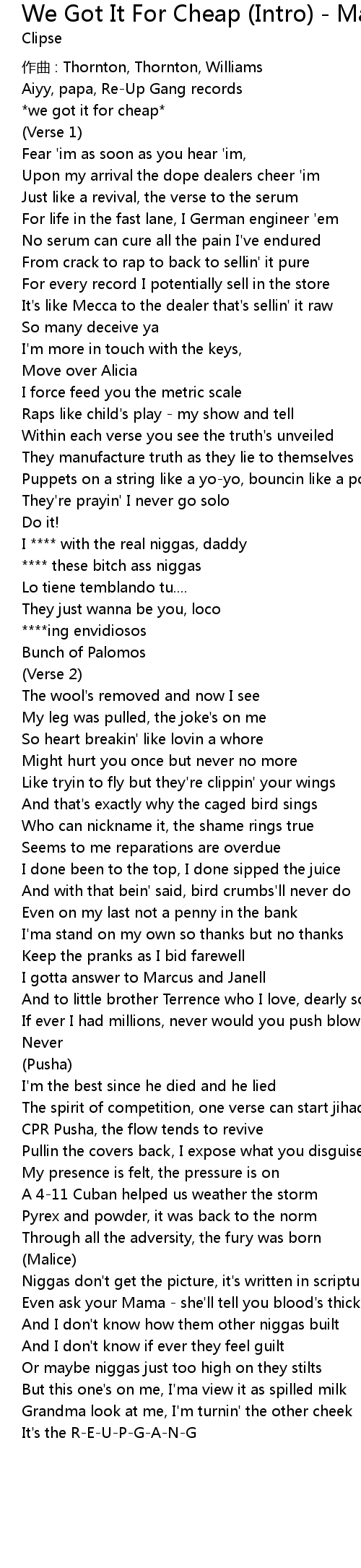 | Song | We Got It For Cheap (Intro) - Main Version - Explicit |