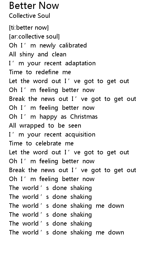 | [00:35.350] | Oh I ' m feeling better now |