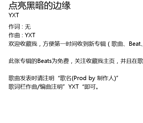 | 歌曲发表时请注明“歌名(Prod by 制作人)” 歌词栏作曲/编曲注明”YXT“即可。 |