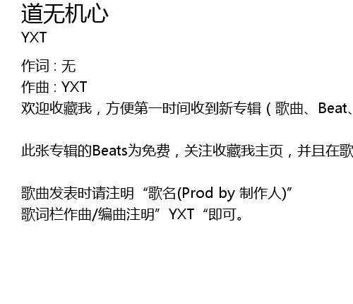 | 歌曲发表时请注明“歌名(Prod by 制作人)” 歌词栏作曲/编曲注明”YXT“即可。 |