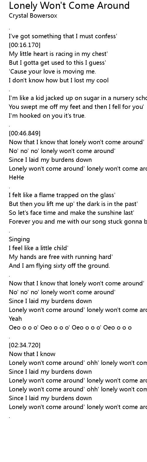 | [02:14.300] | Lonely won' t come around' lonely won' t come around' |