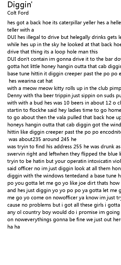 Denny with tha beer trippin just sippin on suds puttinthe shots back trippin with with a bud hes was 10 beers in about 12 o clock my to all the girls whos startin to flockhe said hey ladies time to go home we cant stay here who wants to go about then the vala pulled that back hoe up nowhes diggin got three little honeys hangin outta that cab diggin got the windows tented and a base tune hittin like diggin creeper past the po po encodnitoe like joe dirt thats how hes livin lifes a garden man and hes just diggin [music] was about235 around 245 he was tryin to find his address 255 he was drunk as a skunk an high as a kite swervin right and leftwhen they flipped the blue lights trooper said boy i aint tryin to be hatin but your operatin intoxicatin violatin every bitof the law he said officer no im just diggin look at all them honeys hangin outta that cab diggin with the windows tentedand a base tune hittin like diggin beggin yo yo po po you gotta let me go yo like joe dirt thats how hes livin lifes agarden man and hes just diggin yo yo po po ya gotta let me go yo yo yo po po ya gotta let me go yo come on nowofficer ya know im just tryin to make it home i dont mean to cause no problems but i got all these girls i gotta get emhome safe thats what any ol country boy would do i promise im going home right now just let me come on noweverythings gonna be fine we just out here diggin a lil bit dig ha ha ha ha ha |
