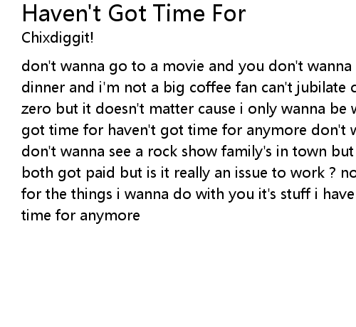 don't wanna go to a movie and you don't wanna see a rock show i've already had dinner and i'm not a big coffee fan can't jubilate cause my cash situation is zero but it doesn't matter cause i only wanna be with you it's stuff i haven't got time for haven't got time for anymore don't wanna go to a movie and you don't wanna see a rock show family's in town but we don't wanna be with them both got paid but is it really an issue to work ? no. it don't serve a purpose for the things i wanna do with you it's stuff i haven't got time for haven't got time for anymore