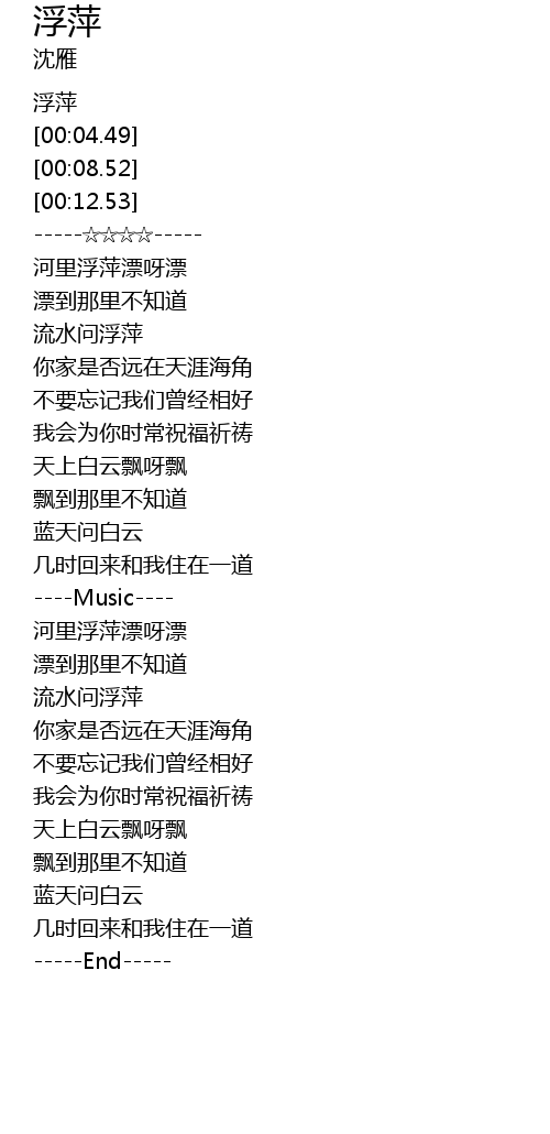 | [00:17.55] | 河里浮萍漂呀漂 |