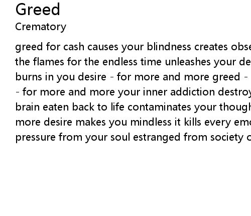 greed for cash causes your blindness creates obsession for might and fame guide the flames for the endless time unleashes your desire greed - obsession - it burns in you desire - for more and more greed - obsession attracts a new desire - for more and more your inner addiction destroys your life not noticed your brain eaten back to life contaminates your thoughts destroys your life more and more desire makes you mindless it kills every emotion in your heart releases the pressure from your soul estranged from society of man |
