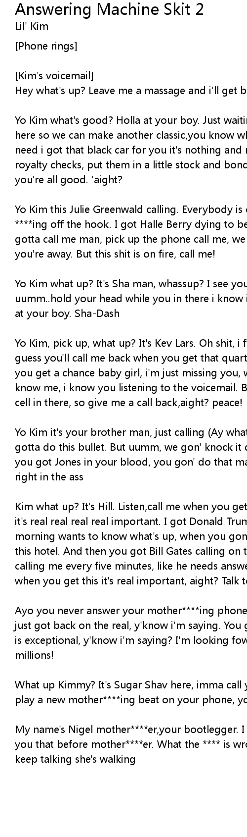 What up Kimmy? It's Sugar Shav here, imma call you every mother****ing day and play a new mother****ing beat on your phone, you heard? Word! |