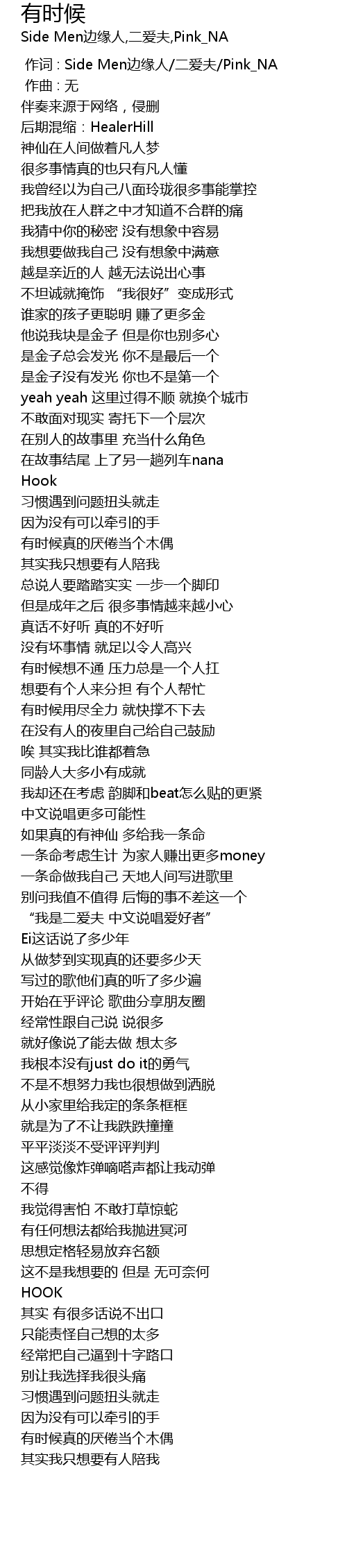 | [00:00.000] | 作词 : Side Men边缘人/二爱夫/Pink_NA |