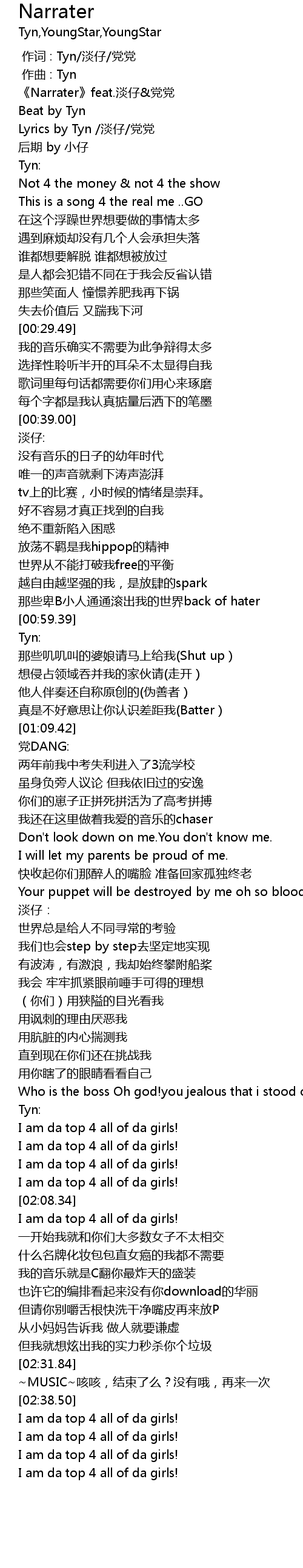 | [00:01.74] | Narrater feat. dàn zǐ dǎng dǎng |