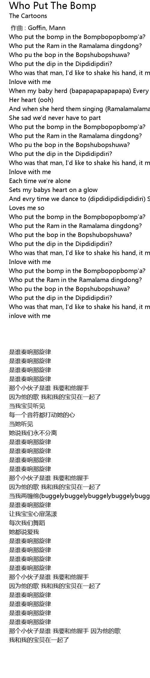 | [02:01.508] | Who put the bomp in the Bompbopopbomp' a? |