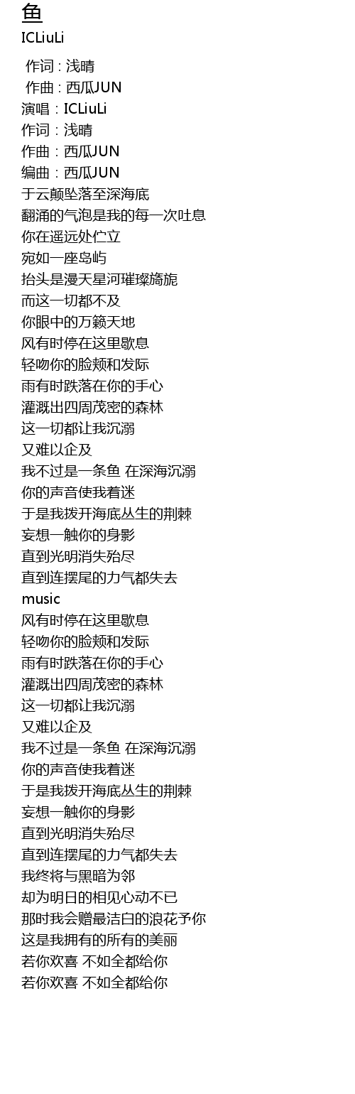 | [01:31.848] | 我不过是一条鱼 在深海沉溺 |