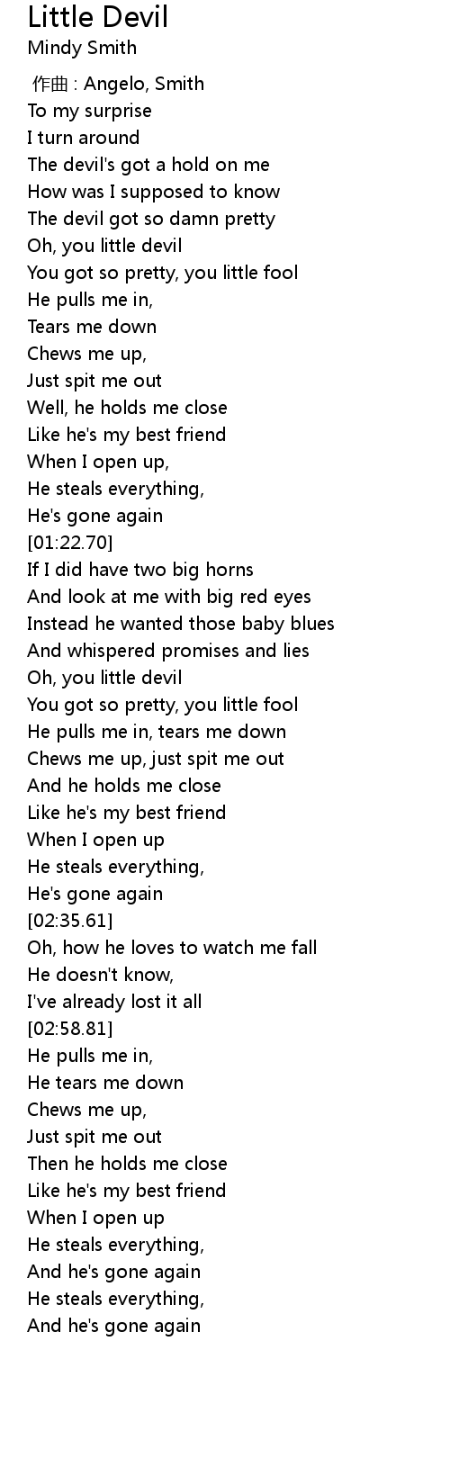 | [00:22.18] | The devil' s got a hold on me |