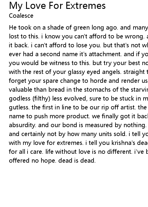 He took on a shade of green long ago. and many a fool along the way have been lost to this. i know you can't afford to be wrong. and we can't either. we want it back. i can't afford to lose you. but that's not what this is about. if love ever had a second name it's attachment. and if you had an ounce of common sense you would be witness to this. but try your best not to be of this world. fly with the rest of your glassy eyed angels. straight to heaven gate and don't forget your spare change to horde and render useless. gold was always more valuable than bread in the stomachs of the starving. and you dare say i'm godless (filthy) less evolved, sure to be stuck in my rut. well i say you're gutless. the first in line to be our rip off artist. the first to change your name to push more product. we finally got it back from the clutches of absurdity. and our bond is measured by nothing. no books, no rounds, no quotas, and certainly not by how many units sold. i tell you krishna's dead to me along with my love for extremes. i tell you krishna's dead! so tell me to go to hell for all i care. life without love is no different. i've been there and it offered no hope. dead is dead. |