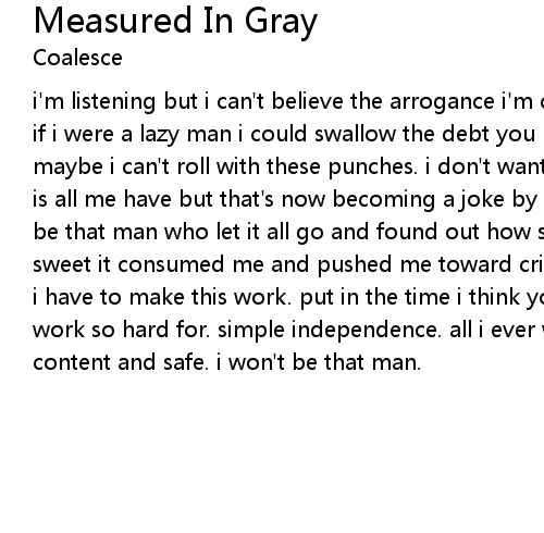 i'm listening but i can't believe the arrogance i'm constantly bombarded with. if i were a lazy man i could swallow the debt you put us in. but now i fear that maybe i can't roll with these punches. i don't want to be that man. independence is all me have but that's now becoming a joke by your actions. i don't want to be that man who let it all go and found out how sweet revenge really is. so sweet it consumed me and pushed me toward crime. oh only if you put in the hours i have to make this work. put in the time i think you want me to beg for what i work so hard for. simple independence. all i ever wanted was for everyone to be content and safe. i won't be that man. |