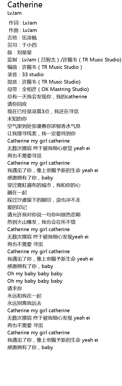 | [00:01.440] | zǒng yǒu yì tiān wǒ huì fā xiàn nǐ, wǒ de catherine |