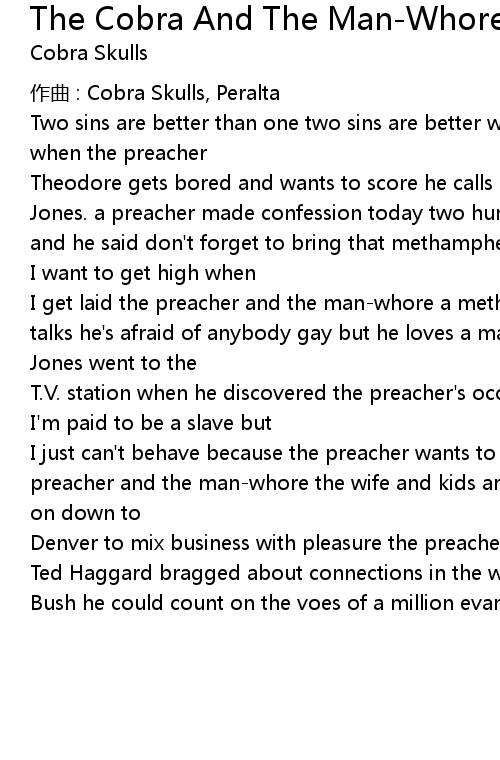 | I get laid the preacher and the man-whore a methamphetamine perfume the preacher talks he's afraid of anybody gay but he loves a man-whore in a motel room | |