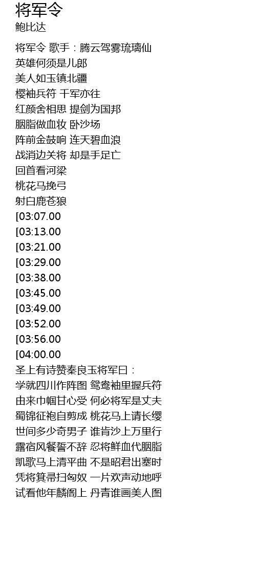 | [00:00.00] | 将军令 歌手:腾云驾雾琉璃仙 |