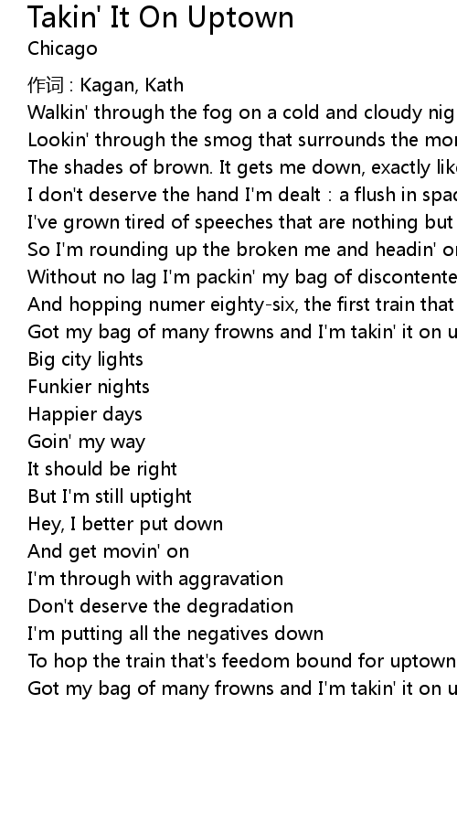 | Got my bag of many frowns and I' m takin' it on uptown. | |