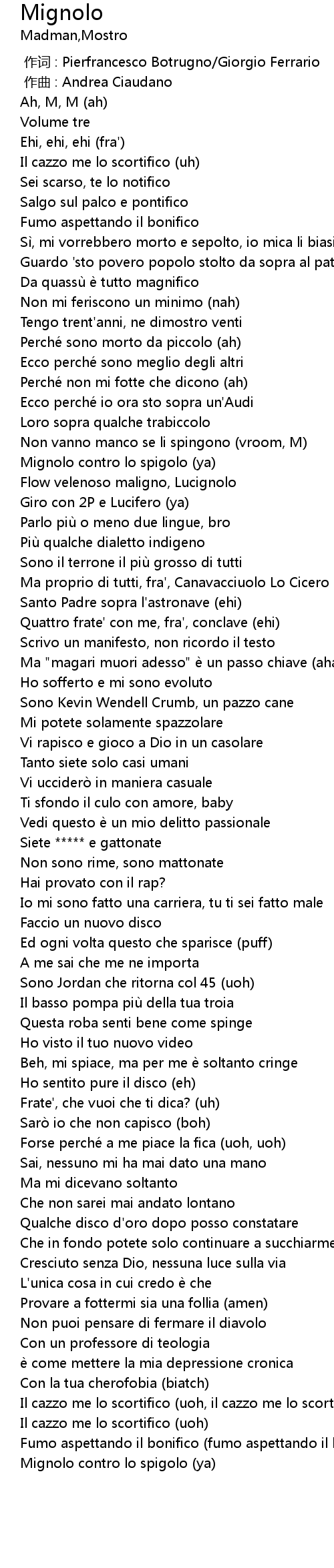 | [01:58.28] | Il cazzo me lo scortifico (uoh, il cazzo me lo scortifico) |