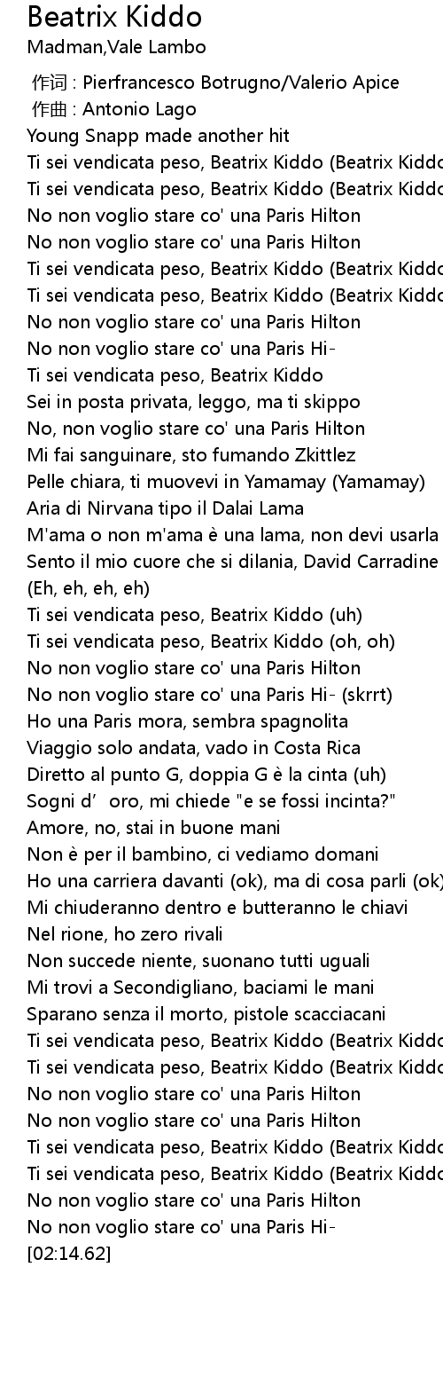 | [00:12.62] | Ti sei vendicata peso, Beatrix Kiddo Beatrix Kiddo |