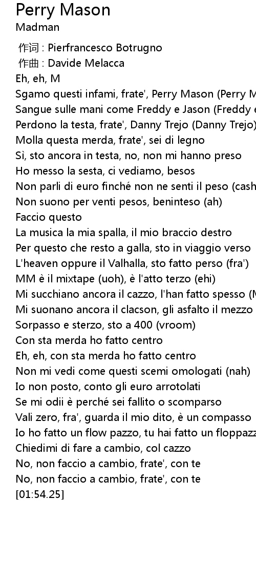 | [00:26.09] | Sgamo questi infami, frate', Perry Mason (Perry Mason) |