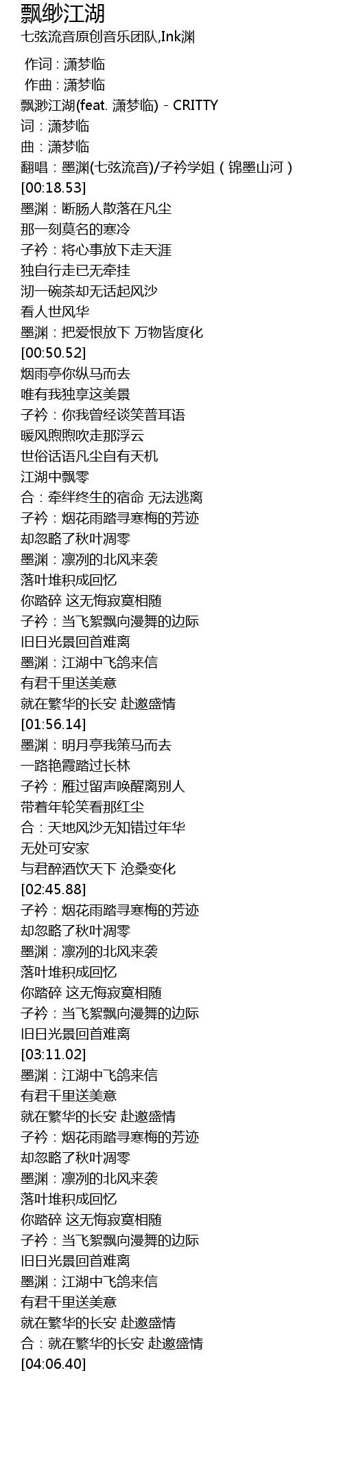 | [00:03.45] | piāo miǎo jiāng hú feat. xiāo mèng lín CRITTY |