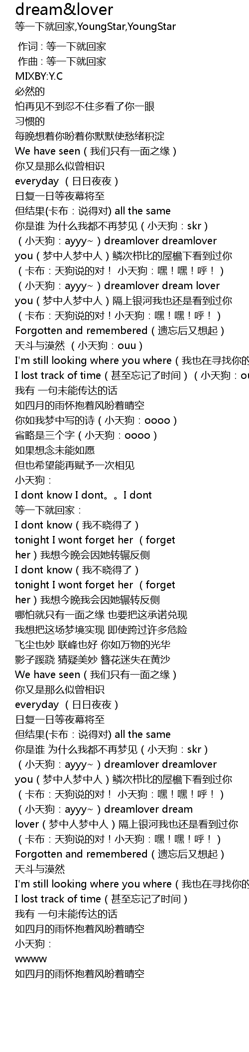 | [00:44.434] | xiǎo tiān gǒu: ayyy dreamlover dreamlover you mèng zhōng rén mèng zhōng rén lín cì zhì bǐ de wū yán xià kàn dào guò nǐ |