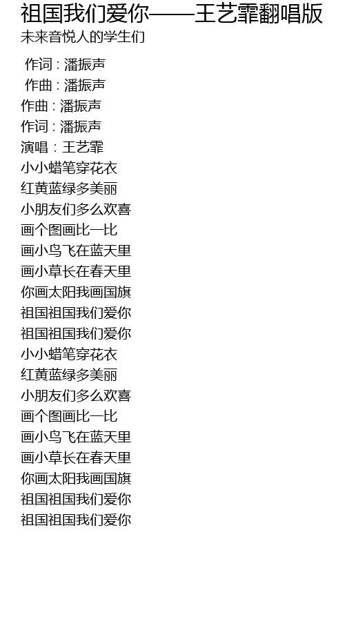 | [01:45.652] | zǔ guó zǔ guó wǒ men ài nǐ |