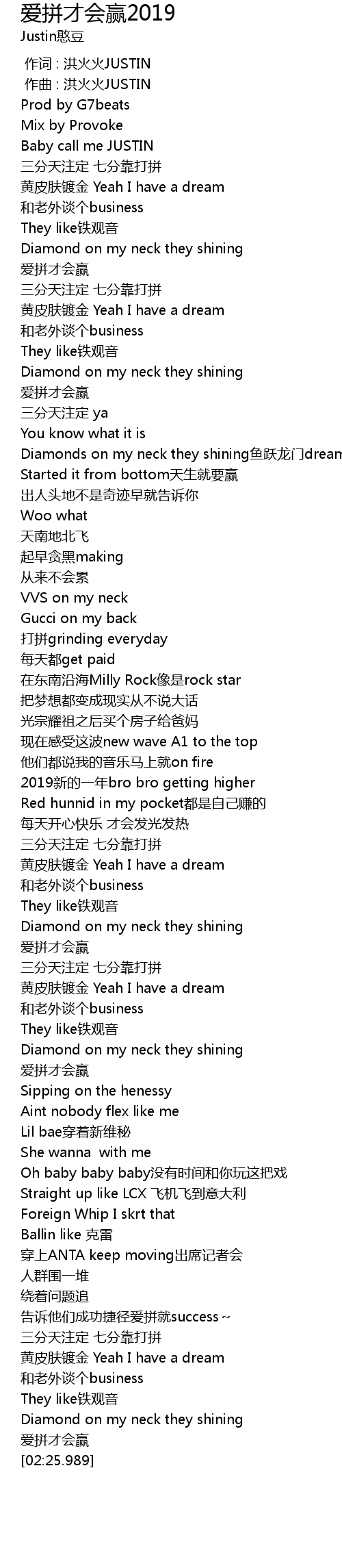 | [00:38.594] | Diamonds on my neck they shining鱼跃龙门dream |