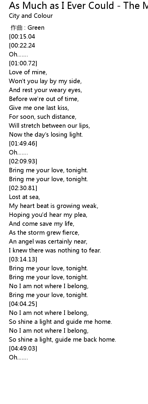 | [05:13.25][00:15.04] | City and Colour As Much As I Ever Could |