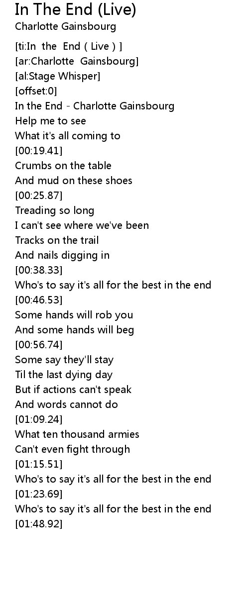 | [00:00.34] | In the End Charlotte Gainsbourg |